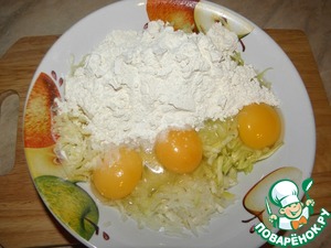 К овощам вбить яйца, добавить муку, разрыхлитель, соль, все хорошо перемешать и оставить на 15 минут постоять.
