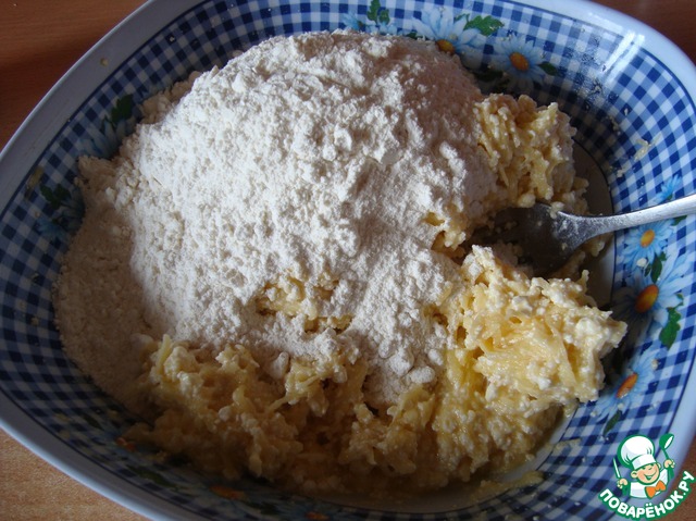 Теперь займемся тестом: перетираем творог (если есть комочки) вилкой до однородности. |