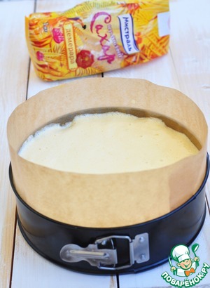 Выстелить форму бумагой для выпечки, вылить половину теста. Выложить слой яблок с корицей.
