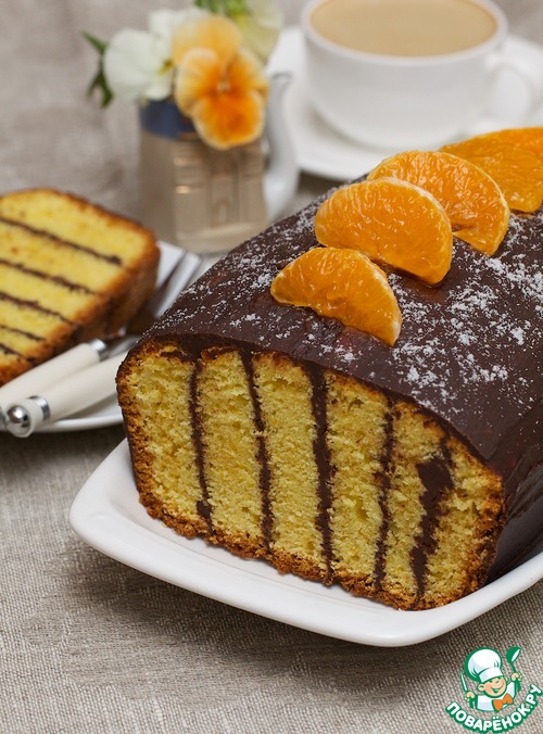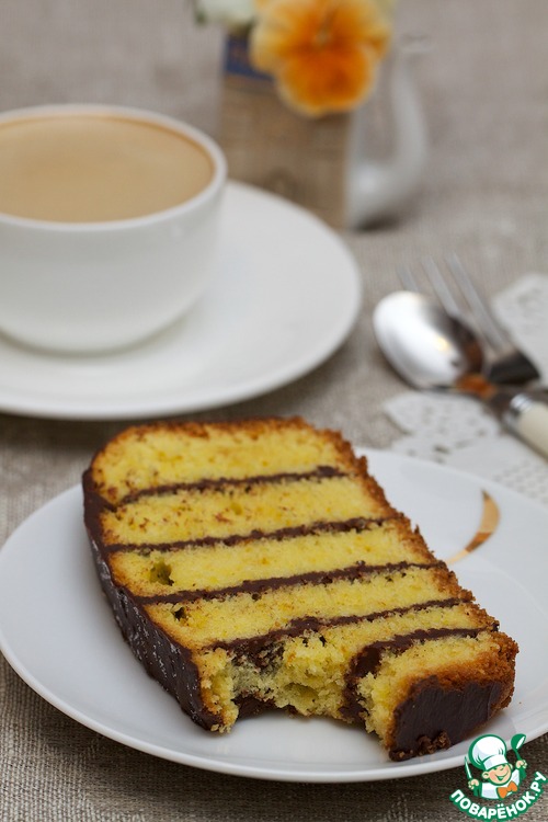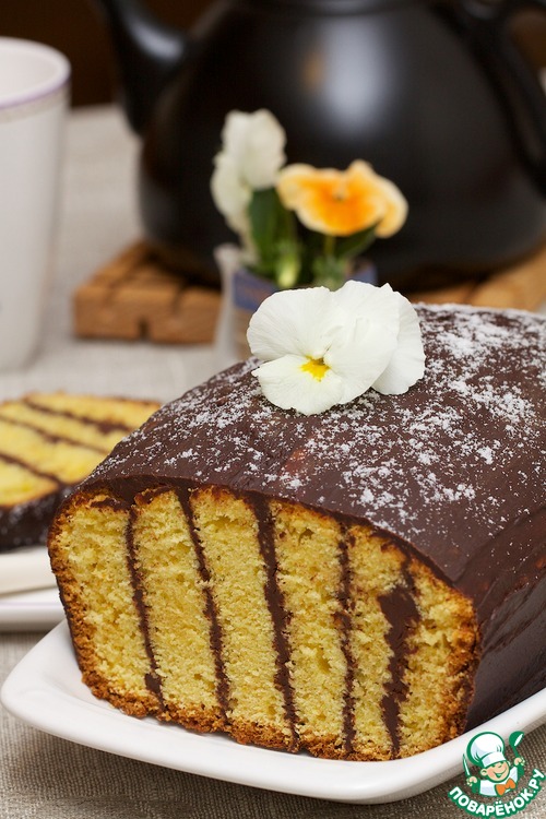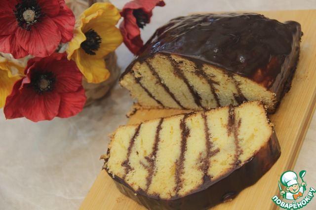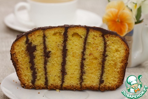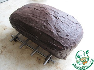 Кекс разрезать вдоль пополам, затем каждую часть разрезать еще на 3 части, всего - 6 длинных полосок кекса. Намазать полоску кекса растопленным шоколадом, сверху положить следующую, намазать и т. д. Собирать, естественно нужно, чтобы не нарушить первоначальный вид кекса.