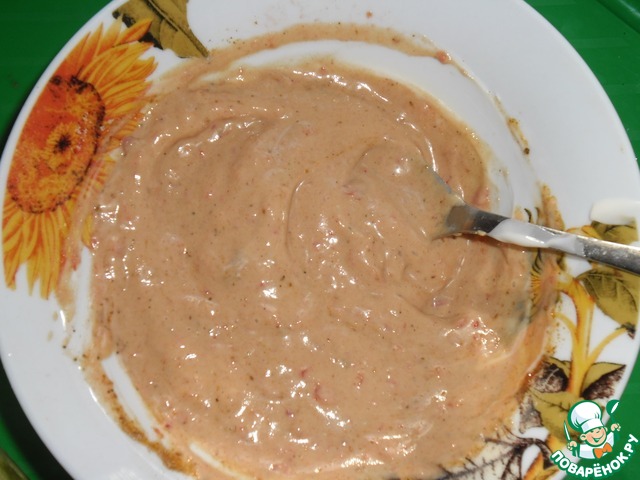 Смешать майонез, аджику, горчицу, специи и 1 ч. л. соевого соуса Киккоман.