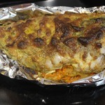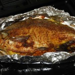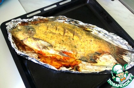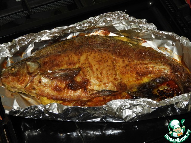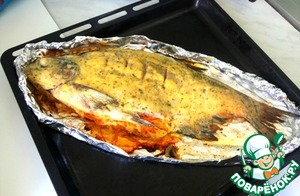 В брюшко леща выложить пассерованные овощи и переместить рыбку в смазанную растительным маслом лодочку из фольги.
