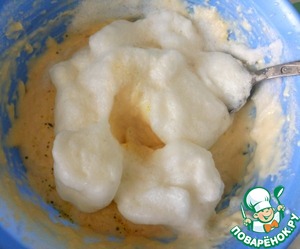 Белки взбить до устойчивых пиков, аккуратно вмешать в тесто.