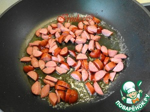 На сковороде растапливаем масло, слегка обжариваем в нем нарезанные колбаски. -