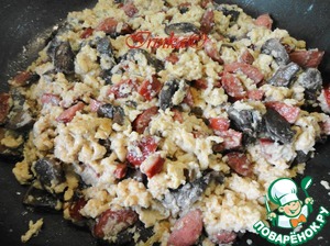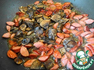 Затем добавляем грибы и обжариваем все вместе, до выпаривания жидкости.