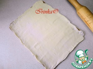 Тесто раскатываем в длину, придавая форму прямоугольника. Лучше это делать сразу на листе для выпечки. -