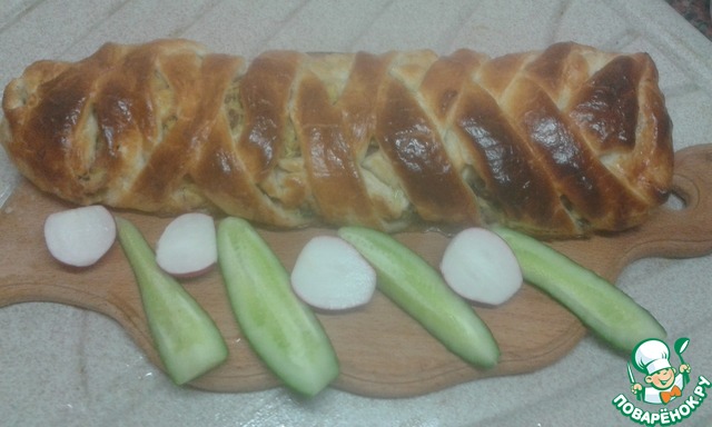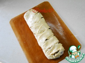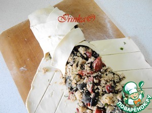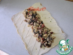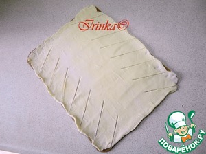 Надрезаем по краям на широкие полоски, оставляя посередине место для начинки.