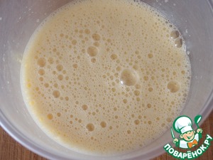 Во взбитые яйца с сахаром добавить растопленное сливочное масло, перемешать. Затем просеять муку с разрыхлителем теста.