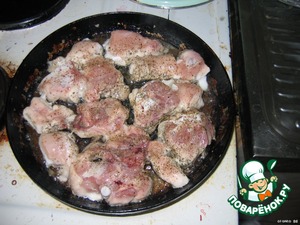 Курицу порезать на порционные кусочки, посолить, поперчить, обжарить на растительном масле до золотистого цвета.