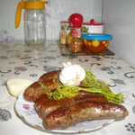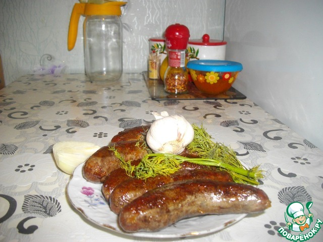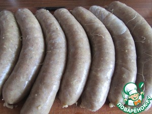 Сформировать из свиной натуральной оболочки и фарша колбаски, при помощи специальной насадки для мясорубки.