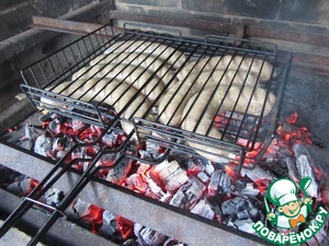 Выложить домашние колбаски на решетку и жарить на углях со средним жаром.