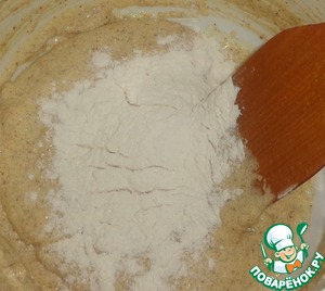 Добавляем муку, разрыхлитель теста. Перемешать.