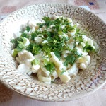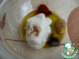 В миске смешать все ингредиенты для соуса (йогурт, горчица, масло, смесь перцев, мускатный орех).