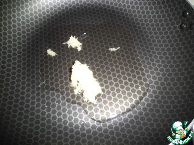 4 зубчика чеснока трем на мелкой терке и отправляем на сковороду, обжариваем на растительном масле пару минут.