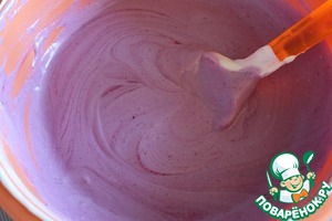 Делим массу на две части, в одну добавляем пюре из черной смородины. Пюре готовиться очень просто: добавляем сахар (50 гр) в 200 гр черной смородины. Провариваем массу на небольшом огне минут 5-7. Пробиваем блендером и протирает через сито.