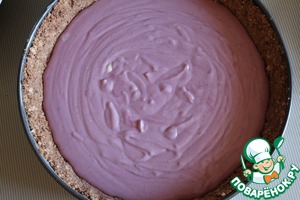 Разъемную форму для торта смазываем сливочным маслом, высаживаем 2/3 шоколадного теста в форму и хорошо разравниваем и формируем бортики. Выкладываем начинку с пюре из черной смородины...
