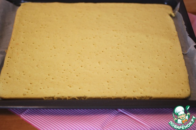 Готовое тесто выкладываем на лист, выстеленный бумагой для выпечки и смазанный сливочным маслом, разравниваем. Выпекаем при температуре 180 градусов Цельсия 10-15 минут, до золотистого цвета. Готовому бисквиту даем остыть, выкладываем на деревянную доску и даем отдохнуть 3-4 часа.