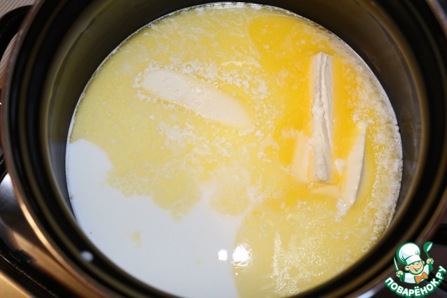 Переливаем смесь обратно в кастрюлю, ставим на небольшой огонь и нагреваем до кремообразного состояния, ни в коем случае не кипятим. В конце добавляем 50 гр масла и 1/2 плитки белого шоколада и хорошо все перемешиваем.
