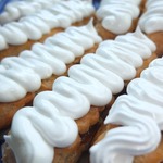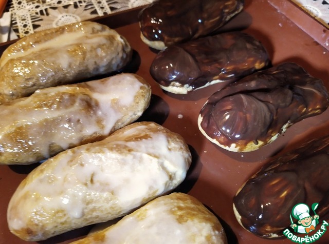 Начиняем эклеры кремом при помощи кондитерского шприца и обмакиваем каждый в шоколадную глазурь.