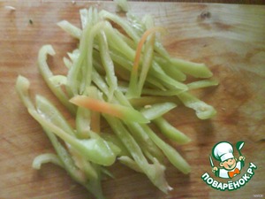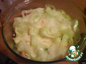 Нарежьте очень тонкими полосками цукини. Я использую для этой цели нож для чистки картофеля (на фото), в магазинах от 30 рублей.