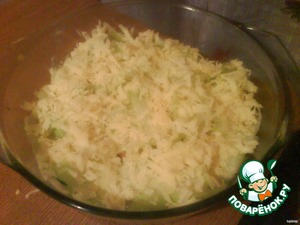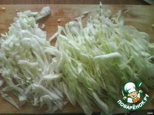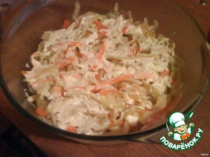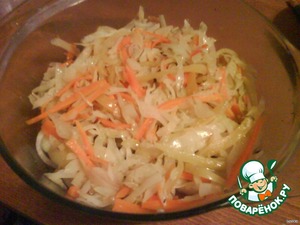 В разогретую сковороду налить немного раст. масла. Положить капусту, налить прим. 50 мл воды. Тушить до полуготовности.