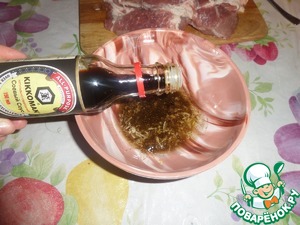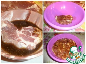 Каждый кусок мяса окунаем в маринад и выкладываем в рабочую чашку. Оставляем на 1 час. ( Можно замариновать на ночь.)