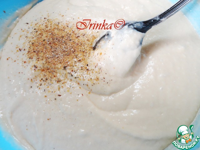 Понемногу всыпаем в жидкую часть, перемешиваем. В конце добавляем приправу для выпечки (можно обойтись ванильным сахаром). Тесто должно получиться бисквитной консистенции. Если густое-добавляем немного молока. -