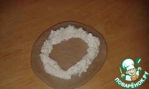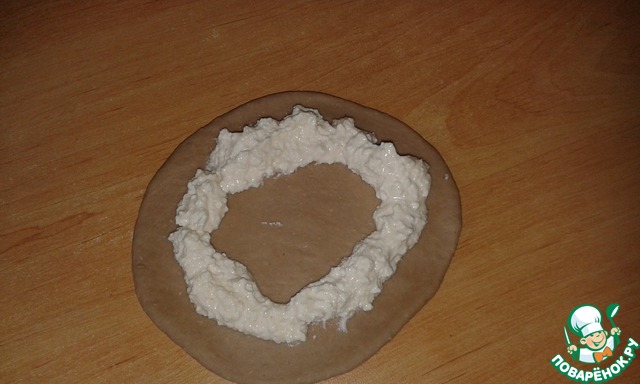 Раскатать каждую часть в лепешку и по кругу выложить творог