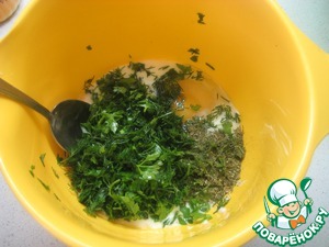 Смешать кефир, яйцо, сахар, нарезанную петрушку и укроп (примерно вышло по 2 ст. л.), добавить специи по вкусу.