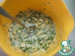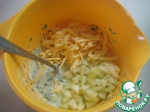Мелко режем лук и добавляем его к кефиру с зеленью. На крупной терке натереть сыр. Половину сыра добавляем в тесто, а половину – оставляем для присыпки пирога.