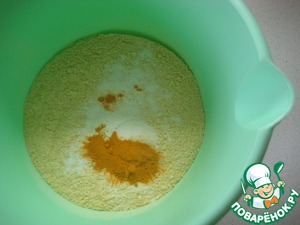 В отдельной посуде соединяем кукурузную муку, куркуму и разрыхлитель теста.