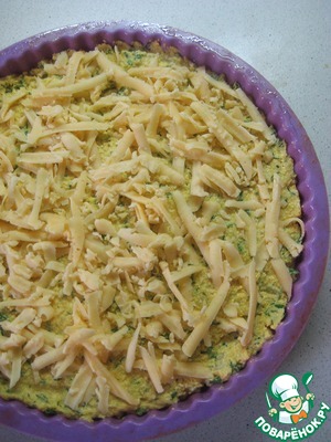 В смазанную растительным маслом форму выкладываем тесто, разравниваем и посыпаем оставшимся натертым сыром.
