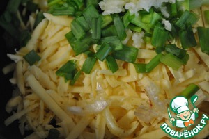 Натираем на крупной тёрке сыр, туда крошим зелёный лук, другую зелень, раздавливаем чеснок, вливаем кефир, оставляя часть в стакане, он нам еще понадобится, и разбиваем яйцо. Перемешиваем, солим. Это - начинка для лаваша.