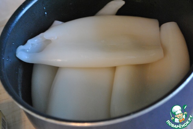 • У меня кальмары уже почищенные. Заливаем кальмарчики кипятком ждём пару минут, и снимаем с них плёночку. После минут двух-трёх в кипятке, она снимается, как чулок.