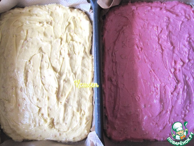 Тесто делим на две части поровну. Я пользовалась весами. Получилось две части по 350 грамм каждая. В одну часть теста добавляем жёлтый краситель и хорошо вымешиваем, в другую часть-розовый краситель и так же хорошо вымешиваем тесто до равномерного цвета. Раскладываем каждый вид теста в отдельную форму, разравниваем поверхность.