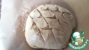На пекарской бумаге ( мою ничем смазывать не надо, если сомневаетесь в своей - смажьте маслом и посыпьте отрубями ) мокрыми руками формуем буханку, делаем на ней несколько продольных надрезов крест накрест острым ножом и даем расстояться под полотенцем минут 30. Духовку разогеваем до 230°С. На дно духовки ставим пустой противень.