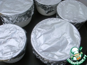 Каждый рамекин сверху накрыть одним слоем фольги и запекать в разогретой до 220 градусов духовке 40 минут.