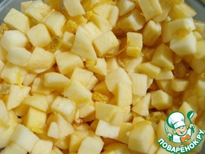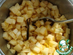 Перемешать промытый изюм, натертую цедру лимона, яблоки и мякоть ванили.