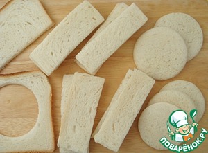 Вырезать из хлеба кружочки в соответствии с размером донышек рамекинов и прямоугольники высотой чуть меньше их высоты.
