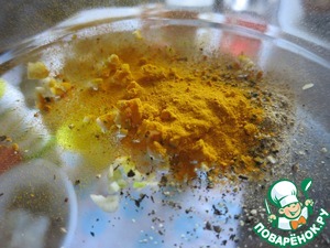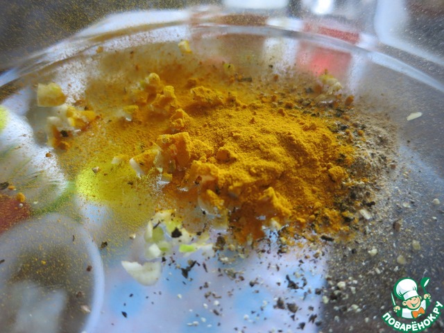 Чеснок мелко нарезать, добавить специи и залить йогуртом