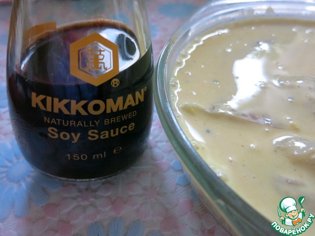 Добавить соевый соус Киккоман и залить полученным маринадом рыбное филе на 30 минут
