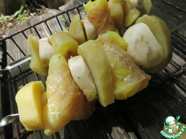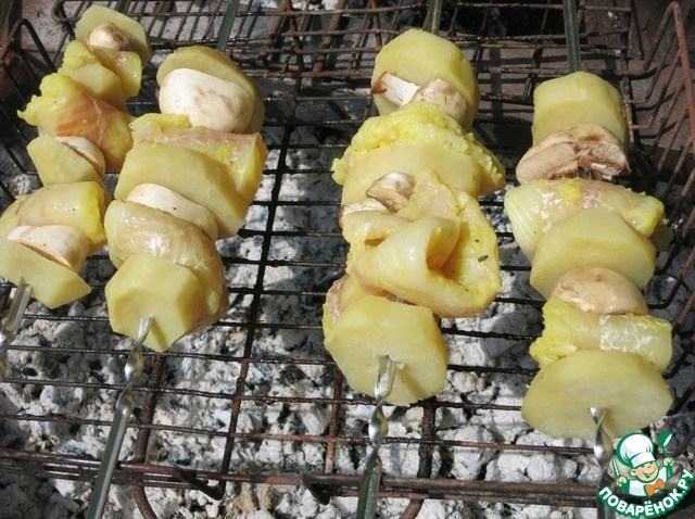 но лучше этого не делать, так как кружочки картофеля, в отличии от грибов, хорошо будут придерживать нежную рыбку на шпажке. -