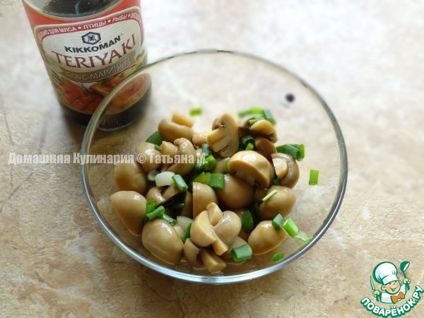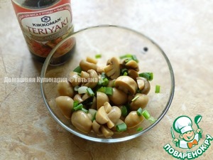 Шампиньоны разрезать пополам, покрошить в них зеленый лук, добавить 1 ст. л. соевого соуса и оставить на 30 минут.