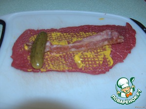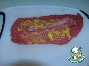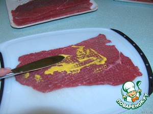 Мясо слегка отбить, смазать горчицей, посолить и поперчить.