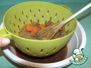 Затем вытащить на тарелку. В этой сковороде обжарить крупно порезаную морковку, лук и сельдерей. Затушить вином и водой, добавить лавровый, соль, перец.