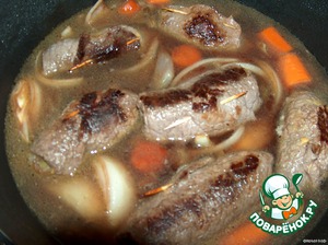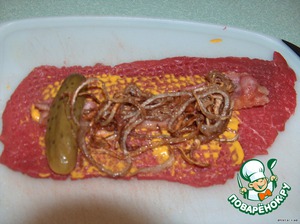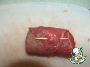 Мясо закручиваем рулетиком и закрепляем зубочисткой или, если есть, спецальной ниткой.