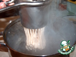 Выдавить в воду тесто. Если нет такой штуки, то тогда положить тесто на досочку и ножом порционально скидывать тесто.