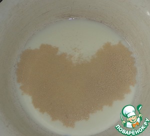 Приготовим дрожжевое тесто. Всыпаем в теплое молоко дрожжи и размешиваем.