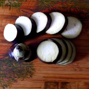 Баклажаны вымыть, обсушить и нарезать кружочками.