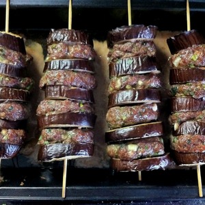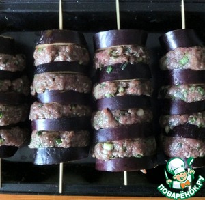 Нанизать на шпажки колечки баклажанов, чередуя их с котлетками из фарша, примерно равными по размеру.